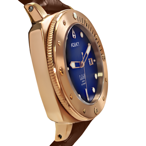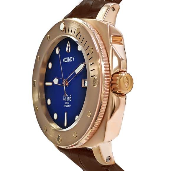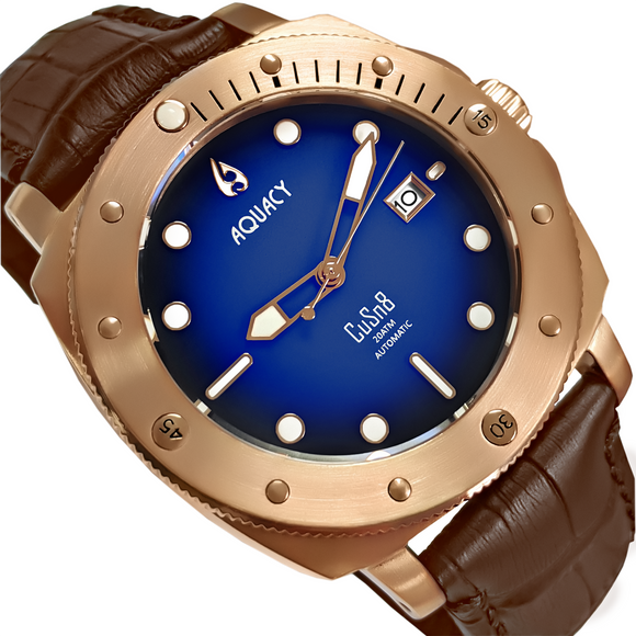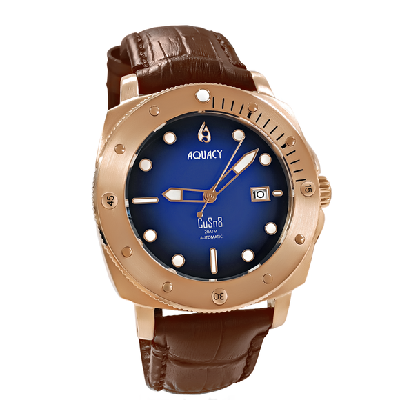 Aquacy Bronze CuSn8 Series Automatic Men's 200m Watch 44mm Black/Blue Dial Brown Strap
