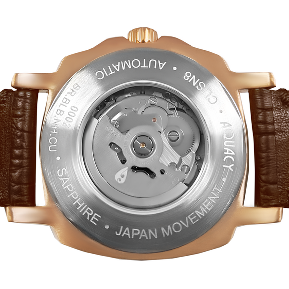| Case Back | Exhibition, Screw down stainless with "Signed" Rotor on Movement "Hei Matau" Aquacy Logo |