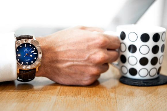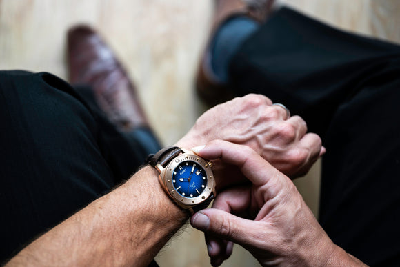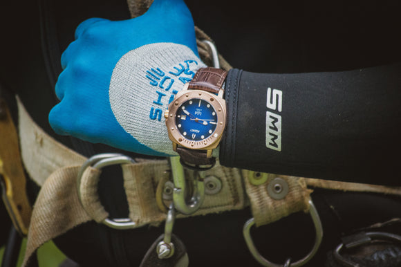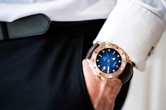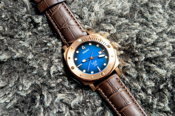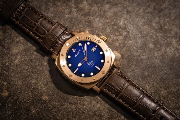 THIS AQUACY BRONZE WATCH IS A SHOWSTOPPER. THE BROWN LEATHER STRAP AND BLUE/BLACK DIAL COMBINATION IS STUNNING