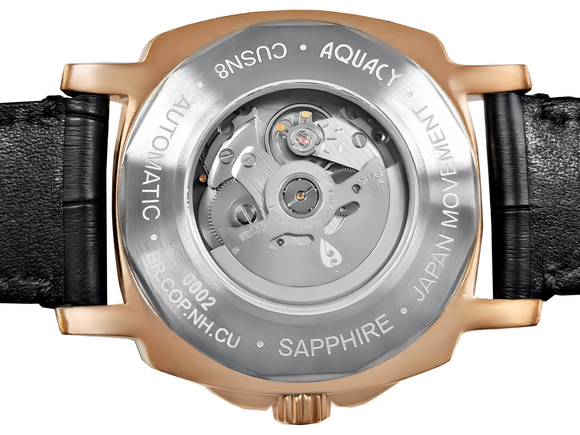 | Case Back | Exhibition, Screw down stainless with "Signed" Rotor on Movement "Hei Matau" Aquacy Logo |