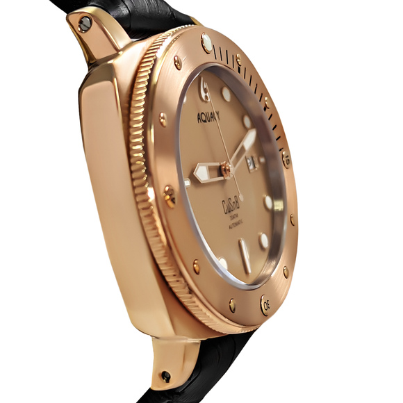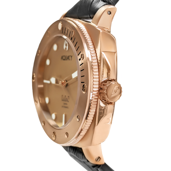 THIS AQUACY MENS WATCH IS AN INSTANT CLASSIC. THE BLACK LEATHER STRAP AND FULLY BRONZE CASE AND DIAL IS SURE TO IMPRESS