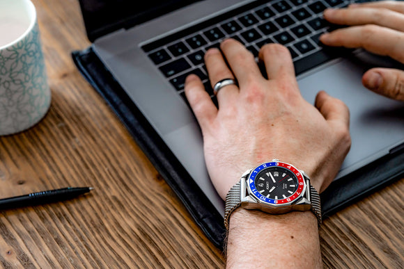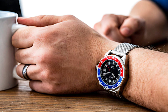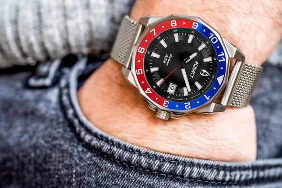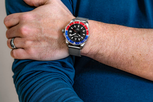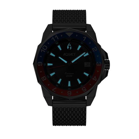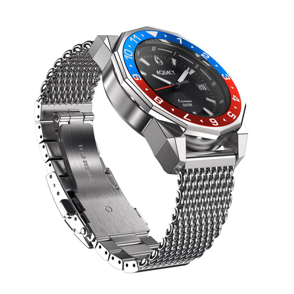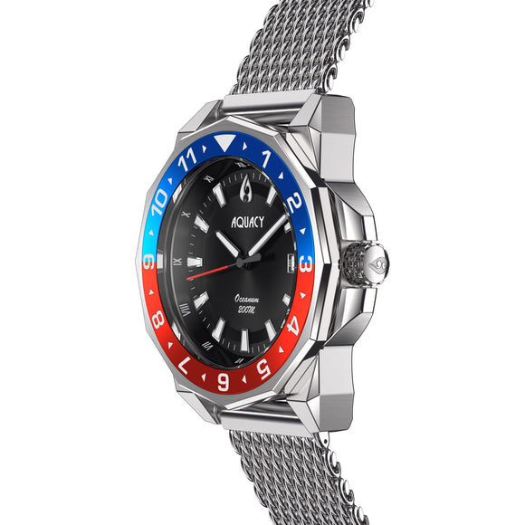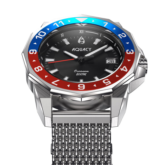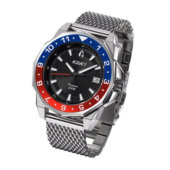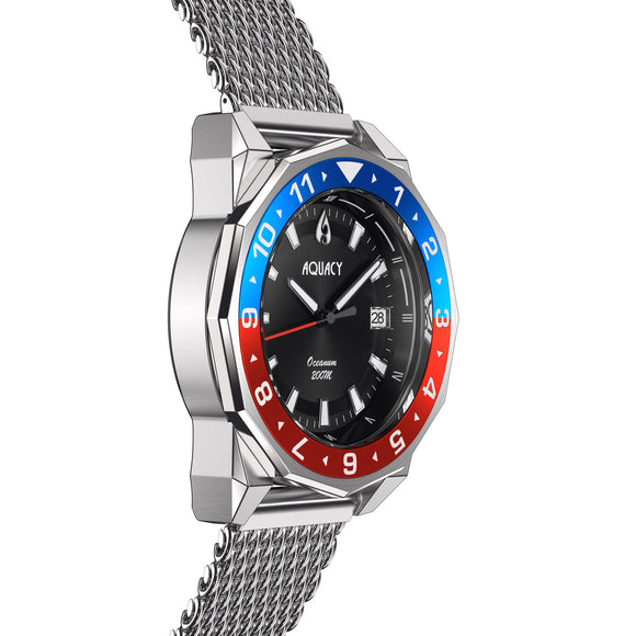 A BLACK DIAL WATCH WITH A PATRIOTIC FEEL! THE AQUACY OCEANUM AUTOMATIC WATCH FEATURES A RED AND BLUE BEZEL WITH A SILVER MESH BRACELET.