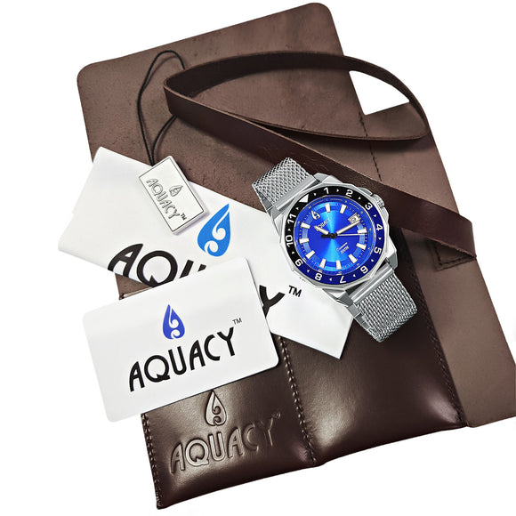 | Box Includes | Watch, Aquacy Branded Genuine Leather 2 Watch Roll, Warranty Card, Hang Tag, Polishing Cloth and Bracelet Sizing Tool. We Did a Watch Roll So You Can Have Something You Can Actually Use Instead Of a Cardboard Box. |