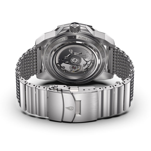 | Case Back | Exhibition, Screw down with Aquacy logo on Rotor |