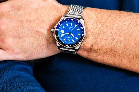 | Bezel | Dodecagon shaped Bezel. Blue and Black aluminum Bezel Insert. 120 click Uni-Directional Rotating |