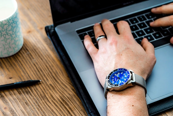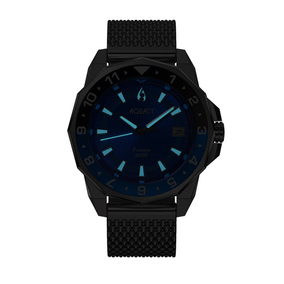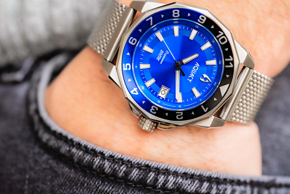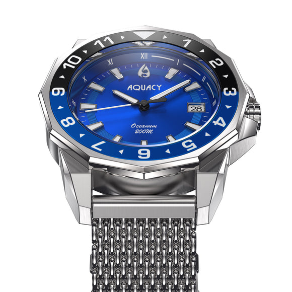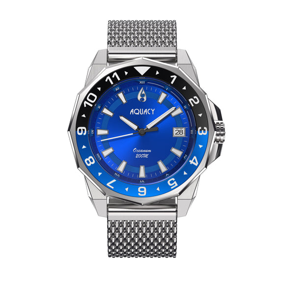 THE AQUACY OCEANUM MEN'S AUTOMATIC WATCH FEATURES A BLUE DIAL AND SILVER MESH BRACELET. IT'S A SHOWSTOPPER BLUE DIAL WATCH.