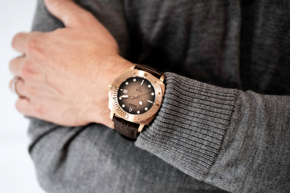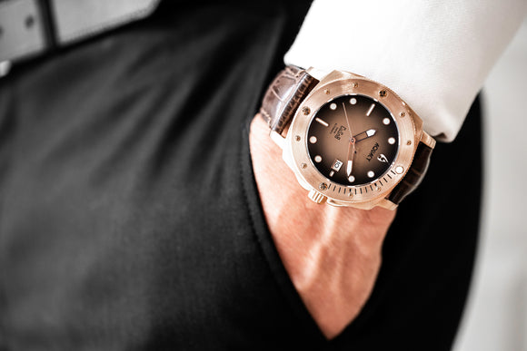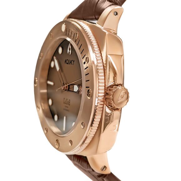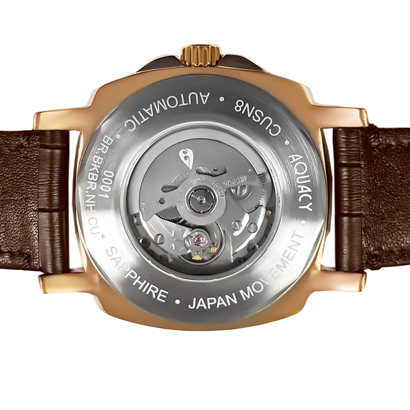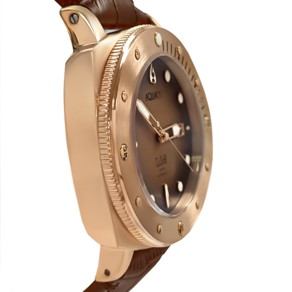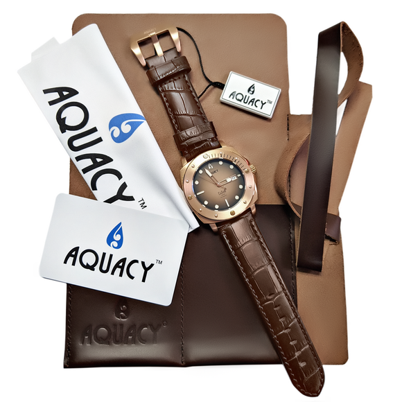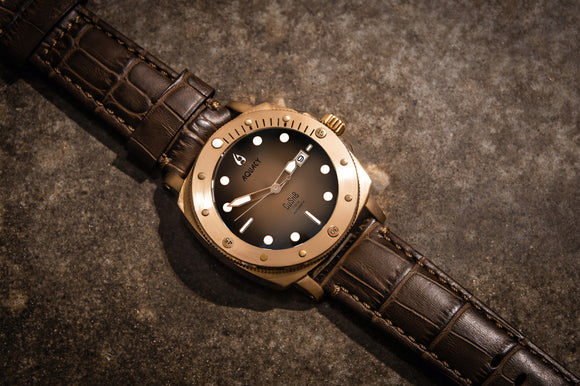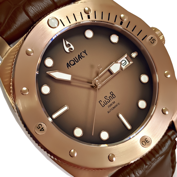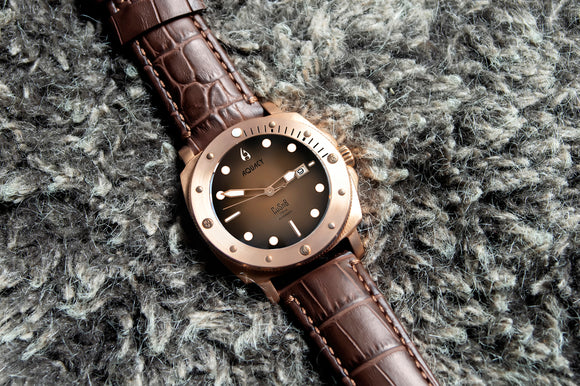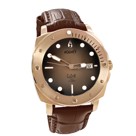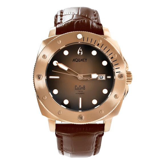 THIS AQUACY MENS WATCH COMES WITH A BROWN LEATHER STRAP, A BRONZE CASE, AND FEATURES A DIAL THAT FADES FROM BLACK TO BROWN.
