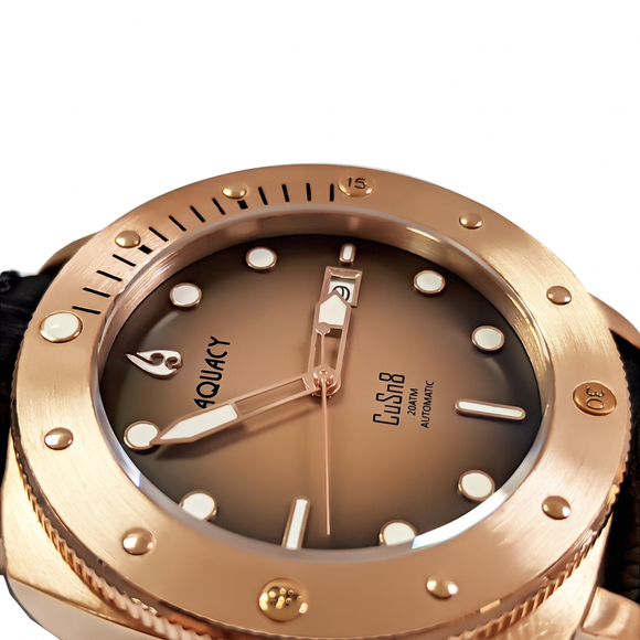 | About The Bronze We Use | CuSn8 is the chemical composition of the metal. It is rose gold in color. It is made usually of 7.5-8% Tin, approx. 92% copper and around 0.30% phosphorus. This mix is highly sought after due to its low amount of impurities, and because it hardly gets any reaction from oxygen. This, in turn, makes the material all the more resistant to all possible forms of corrosion. Your watch may and likely will get a slight Patina over time (much slower rate than lower quality bronze) but the high quality bronze we are using is resistant to corrosion. You can on occasion polish your watch to get rid of any patina that occurs. CuSn8 Bronze is the highest quality bronze for watch making. |