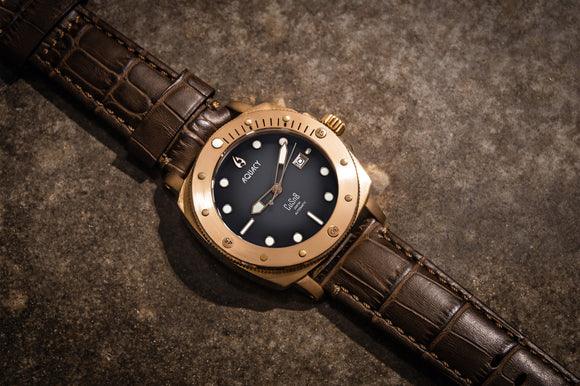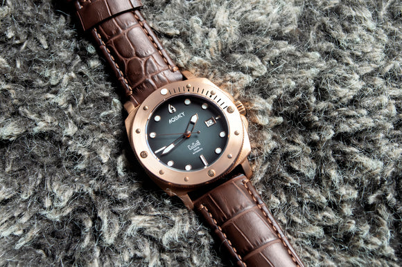 MAKE EVERYONE'S HEAD TURN WITH THE AQUACY BRONZE MENS WATCH. THE BROWN LEATHER STRAP WITH THE DIAL THAT FADES FROM BLACK TO GRAY IS A STUNNING COLOR COMBINATION.
