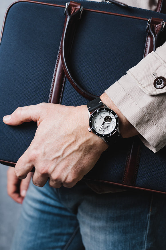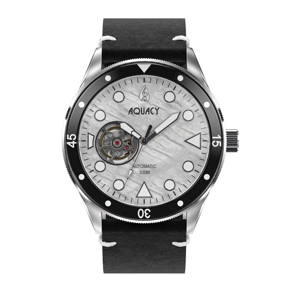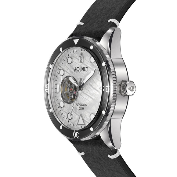 A WHITE MOTHER OF PEARL DIAL CONTRASTS BEAUTIFULLY WITH A BLACK BEZEL AND BLACK LEATHER STRAP IN THE AQUACY CAVE DIVER MENS AUTOMATIC WATCH