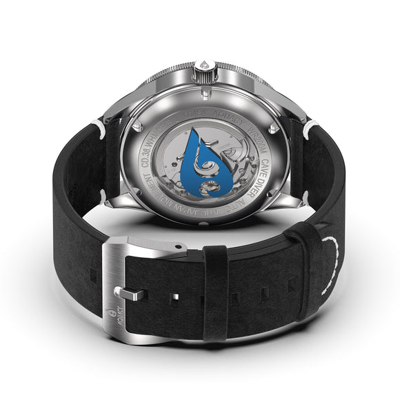 | Band Material | Thick and High Quality Crazy Horse Black Saddle Leather, Embossed on Inside of Strap with Aquacy Logo and 'Saddle Leather" with White Contrast Stitching to Match Dial |