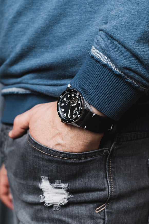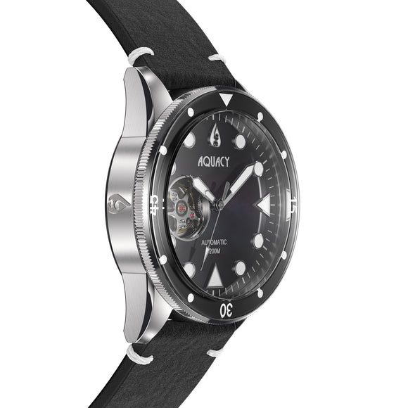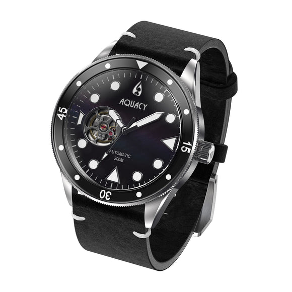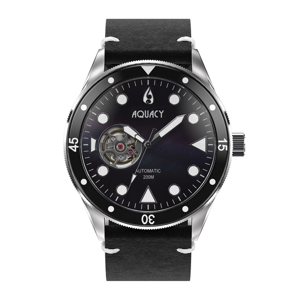 THIS AQUACY DIVE WATCH SPORTS A BLACK MOTHER OF PEARL DIAL AND BLACK LEATHER STRAP TO ELEVATE ANY OUTFIT