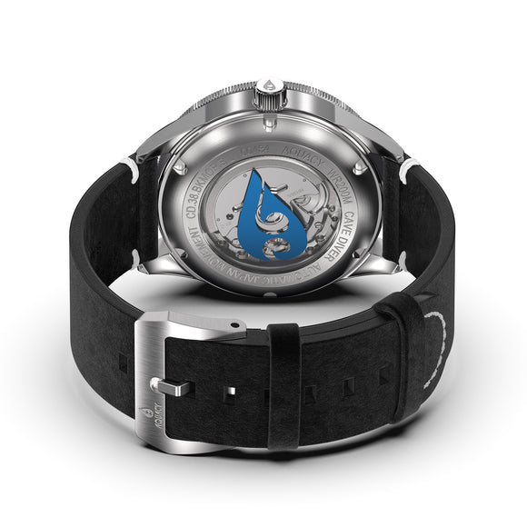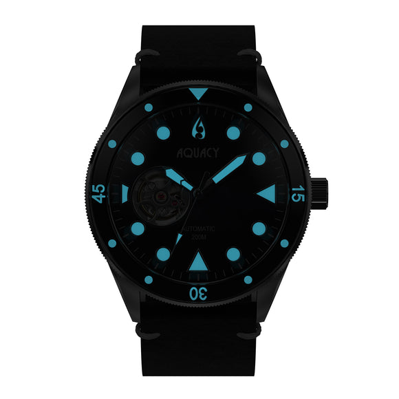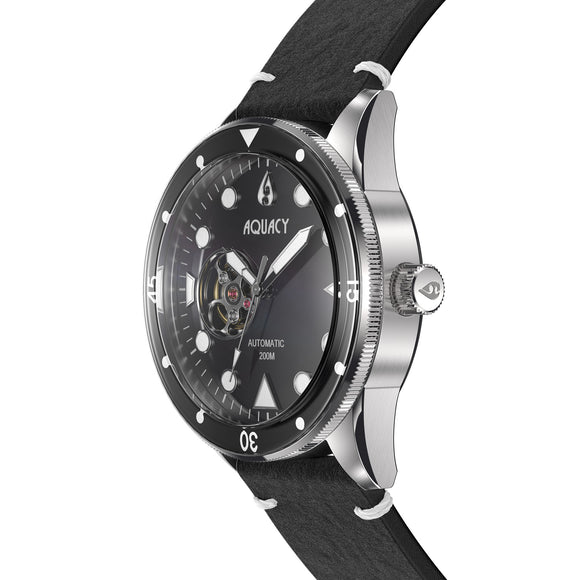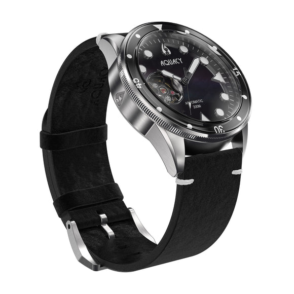 | Band Material | Thick and High Quality Crazy Horse Black Saddle Leather, Embossed on Inside of Strap with Aquacy Logo and 'Saddle Leather" with White Contrast Stitching |